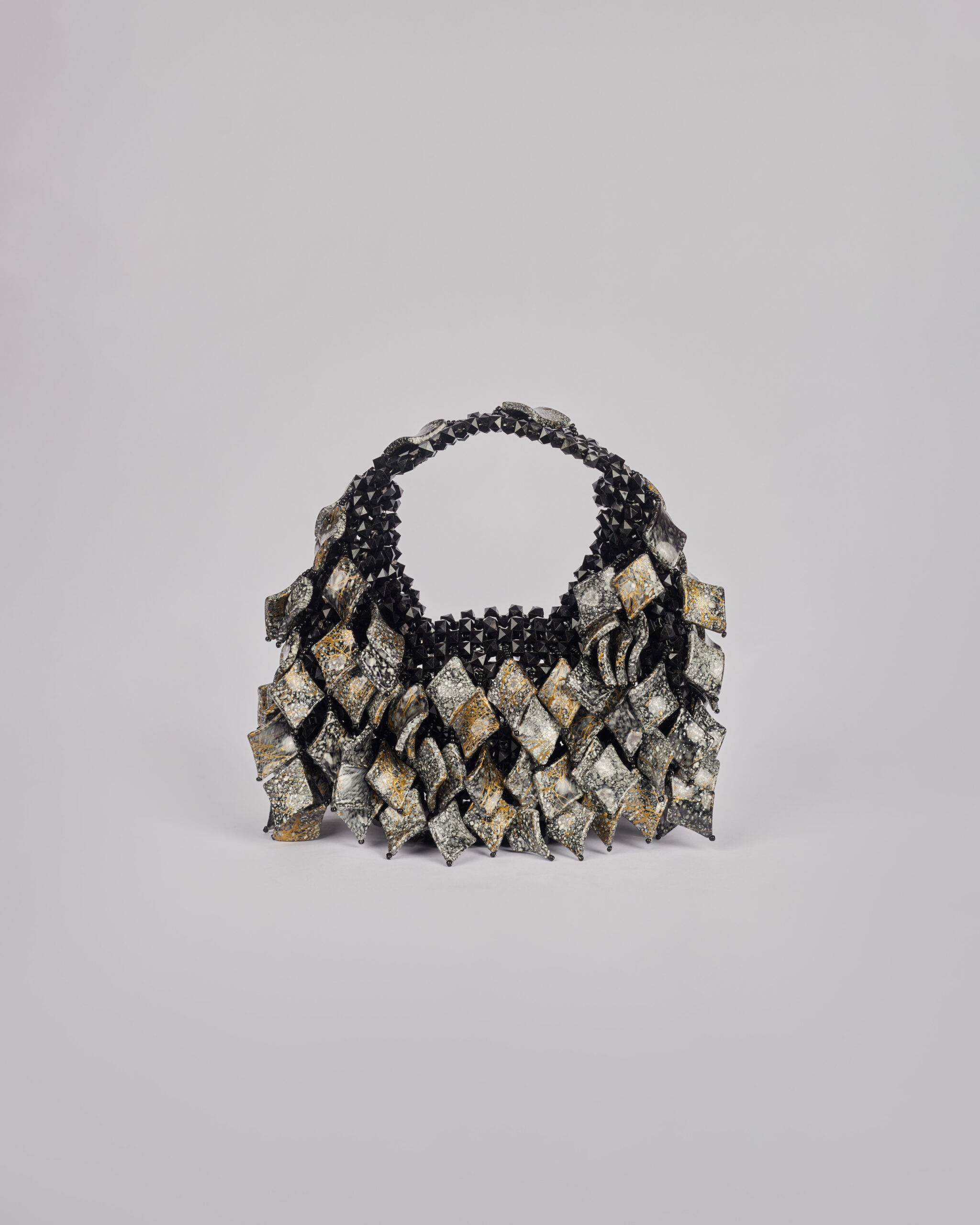 A handcrafted beaded bag that redefines texture and structure. Designed with a rounded silhouette, it features layered bead accents that cascade across the surface, creating a fluid, leaf-like effect. The handle is fully beaded and seamlessly integrated into the body, adding both strength and cohesion. Sculptural yet wearable, this piece is a statement accessory that blends bold craftsmanship with organic movement.