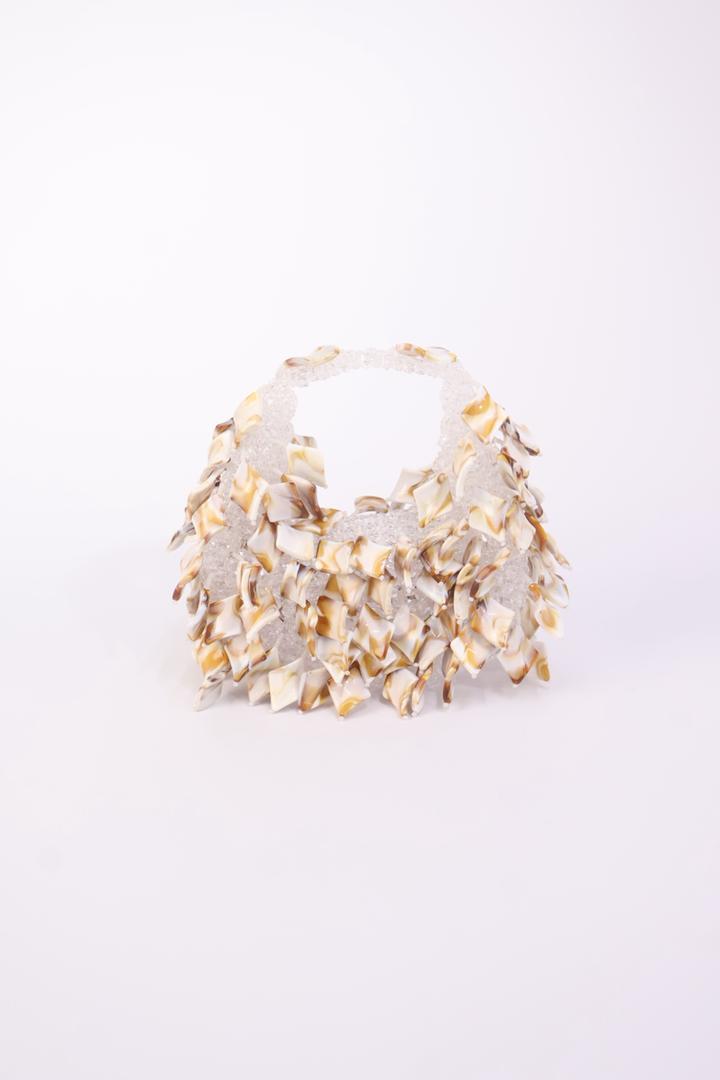 A handcrafted beaded bag that redefines texture and structure. Designed with a rounded silhouette, it features layered bead accents that cascade across the surface, creating a fluid, leaf-like effect. The handle is fully beaded and seamlessly integrated into the body, adding both strength and cohesion. Sculptural yet wearable, this piece is a statement accessory that blends bold craftsmanship with organic movement.
