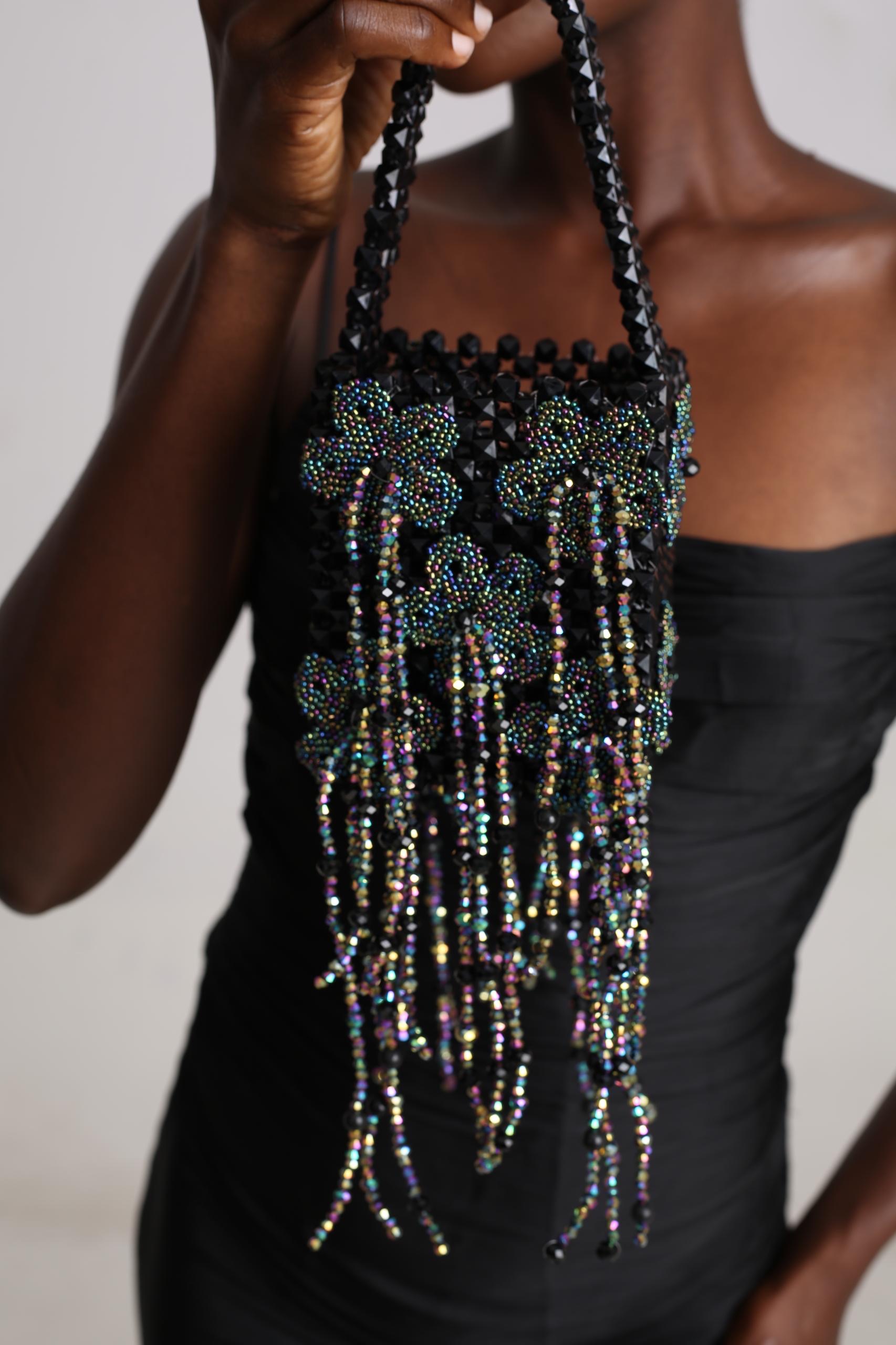 This handcrafted bag features intricate floral beadwork on its structured body, finished with cascading pearl-like fringes that move gracefully with every step. Its elongated silhouette and beaded handle strike the perfect balance between elegance and artistry. A statement accessory designed to capture light, motion, and attention wherever it goes.
