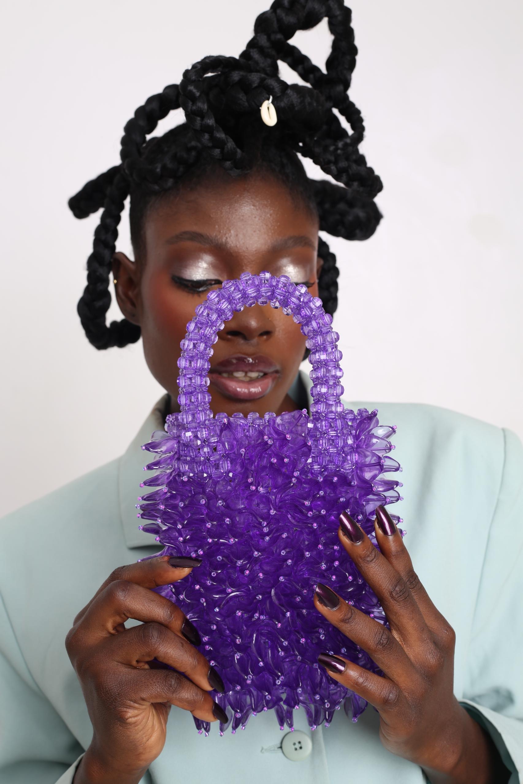 This handcrafted bag features a single sturdy beaded handle and a body covered in elongated clustered beads that resemble flames in motion.