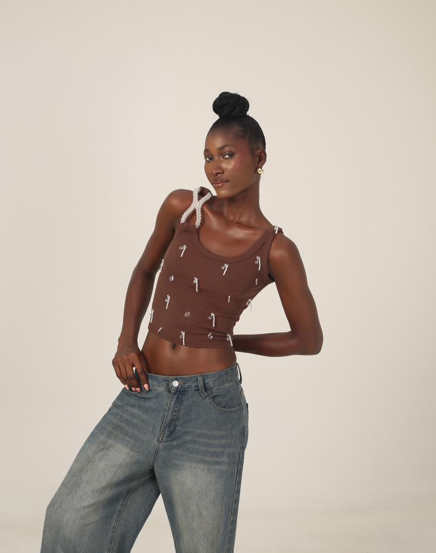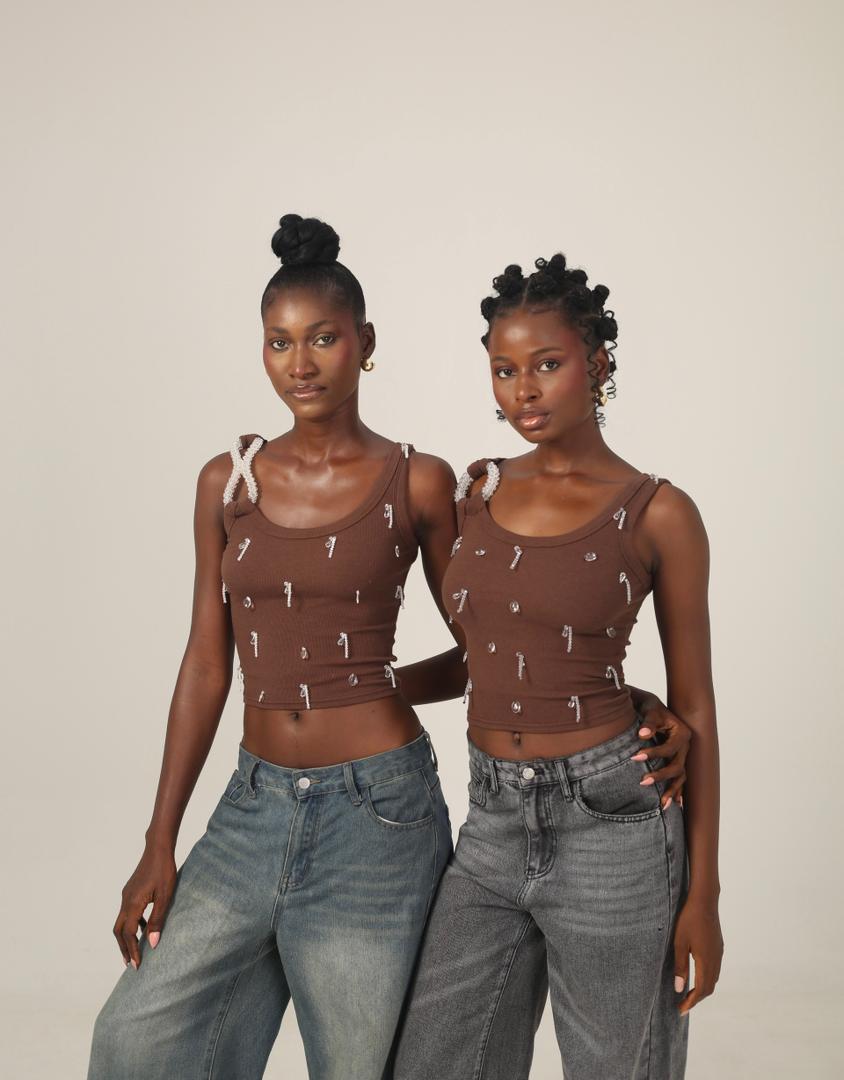 The fit may vary depending on torso length. For longer torsos, the tank appears slightly cropped. For shorter or average torsos, it sits at the waist for a more standard length fit.