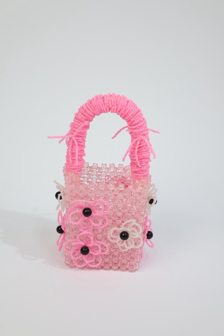 The wrapped beaded handle adds texture and a touch of playfulness, while the floral embellishments with dark bead centers bring depth and character. Compact yet striking, it’s perfect for carrying your essentials in style.