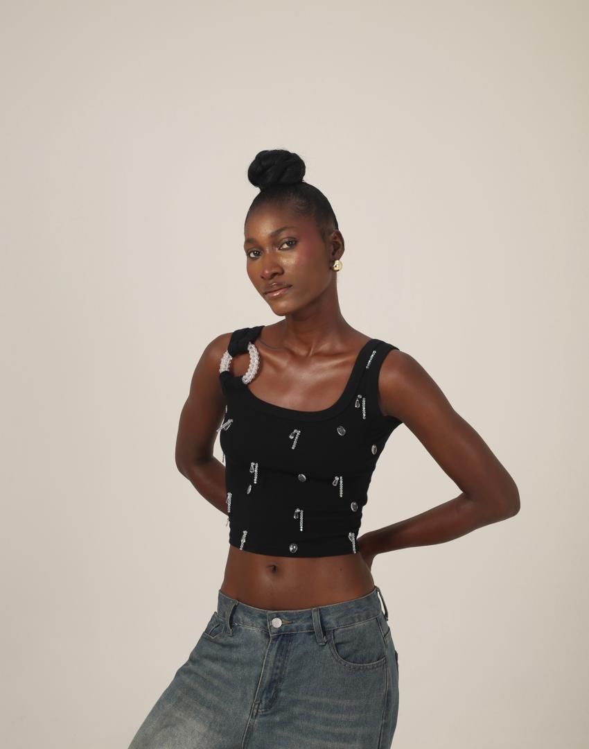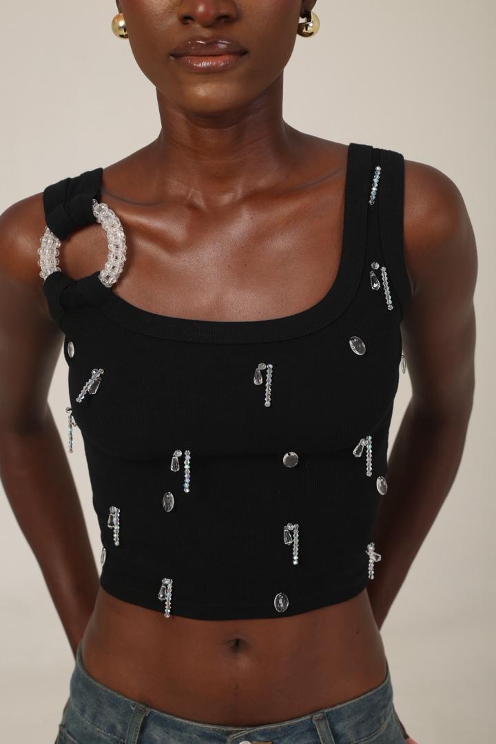 The fit may vary depending on torso length. For shorter or average torsos, it sits at the waist for a more standard length fit. For longer torsos, the tank appears slightly cropped.